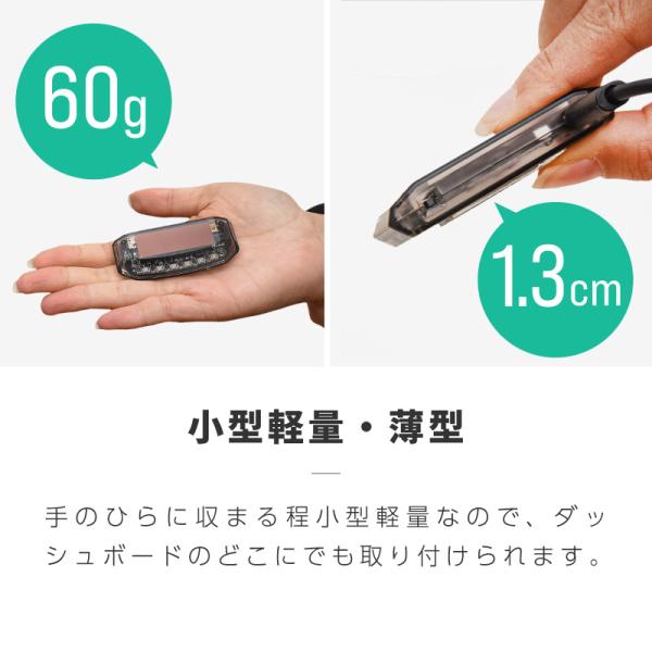 両面テープでダッシュボード等見える場所に貼り付けるだけの簡単取り付けで不審者に光で警告します。