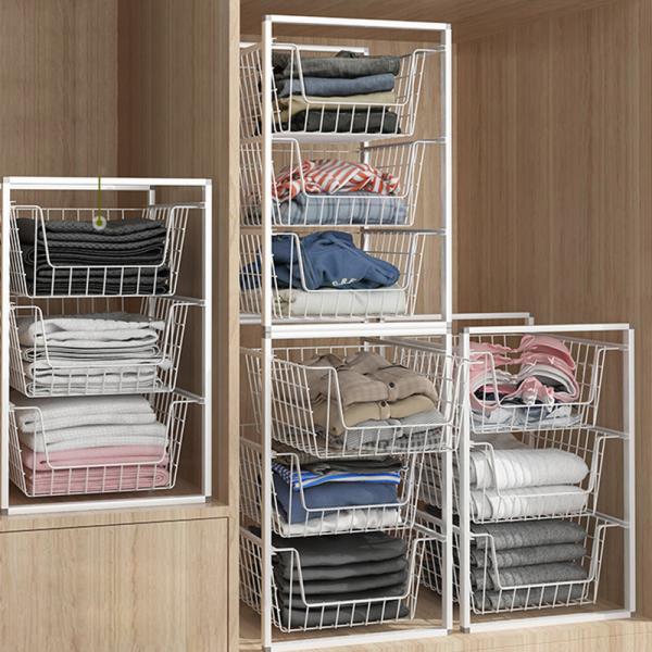 ワイヤーバスケット 引き出し スタッキング 衣類収納 3段ワゴン 3段ラック 3段ボックス ランドリーバスケット ランドリーワゴン ランドリーラック メッシュ かご クローゼット 収納 押し入れ収納 ラック 整理棚 押し入れラック おしゃれ 洋服をバスケットの中に入れるだけでキレイに収納できます。