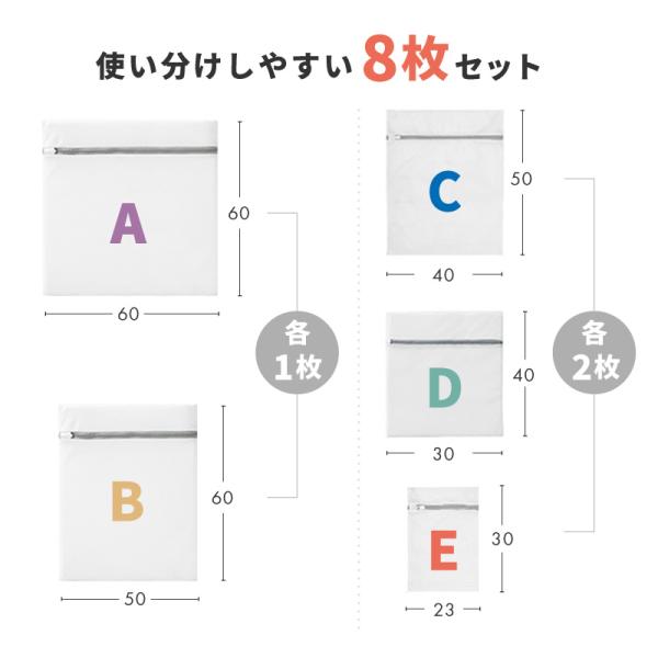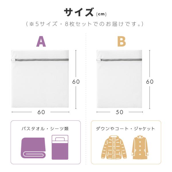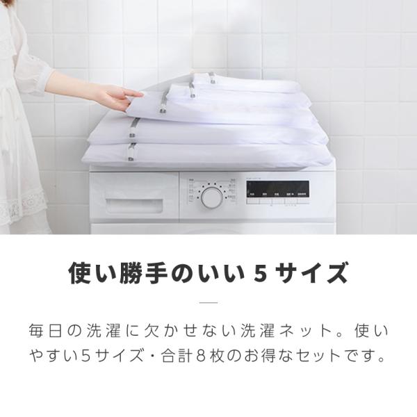 洗濯ネット セット 8枚 特大 大 中 小 5サイズ ランドリーネット 大きい 大きいサイズ 小さめ 小さい 小物 小分け 小型 大容量 型崩れ防止 下着 靴下 パッキング 旅行 収納 毎日の洗濯に便利な、5サイズ8枚セットの洗濯ネットです。