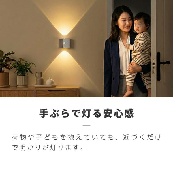 荷物を持っていても近づくだけで点灯し、玄関や廊下、階段などの室内をやさしく照らします。