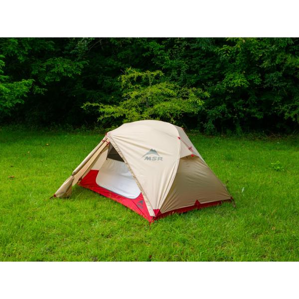 エリクサーは、MSRのバックパッキングテント・シリーズの中では最も居住性が高いモデルです。2 本のポールを2箇所で交差させ、天井部にさらに短いポールを追加することで箱型に近い空間をつくり、快適な居住性を実現しています。他のモデルよりも厚手の生地を使っているために耐久性が高いのも特徴。台形の前室は広く使いやすく、インナーテントの天井にはギアポケットも装備。付属のフットプリントを使用すれば、フライシートとポールのみでの設営も可能です。