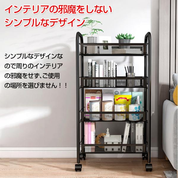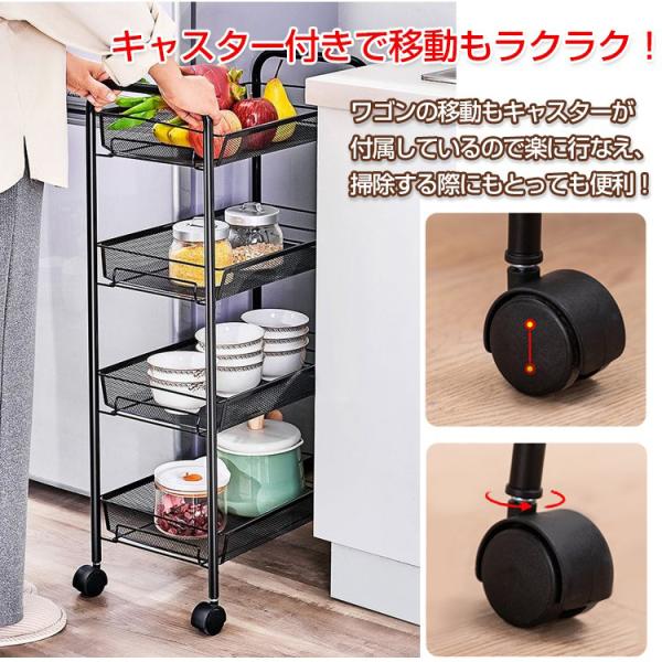 キッチンワゴン キャスター付き 4段 スリム スチール製 メッシュ底板 バスケット キッチンラック キッチン収納 メタル 隙間収納 シェルフ フック付き カート 棚