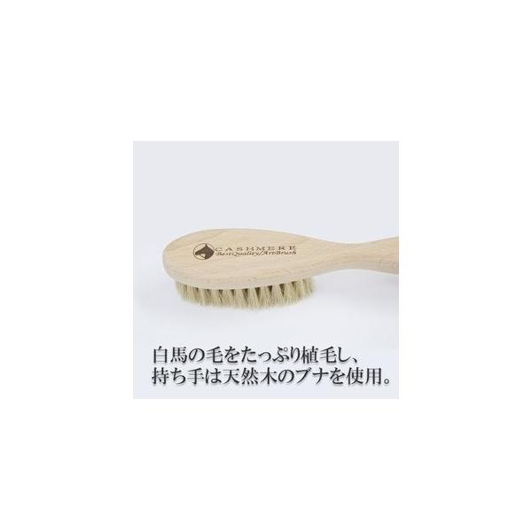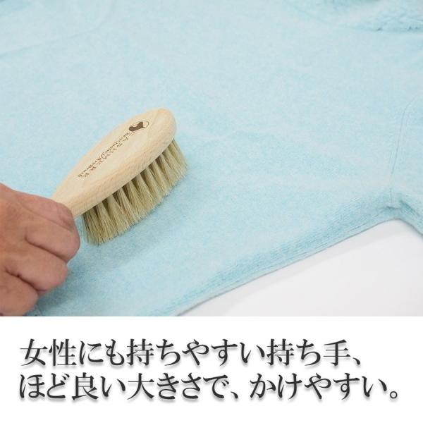 女性にも持ちやすい持ち手と、ほど良い大きさがあり、かつ軽量のミドルタイプの洋服ブラシを作りました。カシミヤはもちろん他の生地にもご使用いただけます。白馬の毛をたっぷり植毛し、持ち手は天然木のブナを使用。