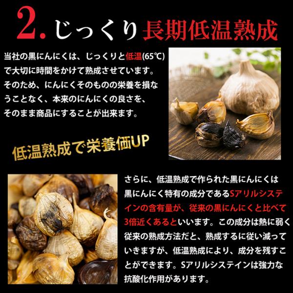 生にんにくは時間をかけて熟成させることで特有の臭いが弱まり、甘くてフルーティ、味わい豊かな黒にんにくに生まれ変わります。