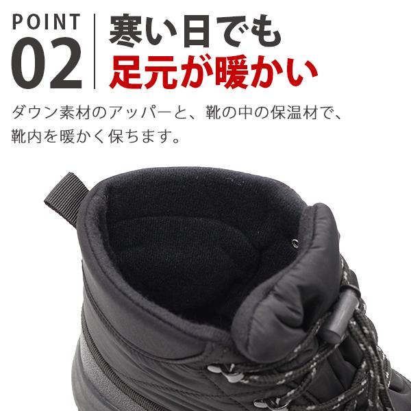 4cm×4時間防水仕様で、靴の中に水が侵入しにくく、雨の日も快適に歩けます。ダウン素材のアッパーと、靴の中の保温材で、靴内を暖かく保ちます。アウトソールは防滑仕様なので、冬場の濡れた路面でも安心です。インソールはクッション性があるので、足をやさしくサポートします。