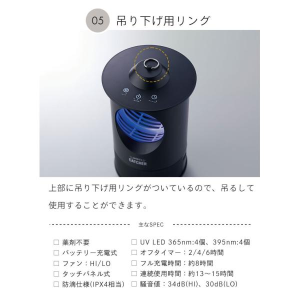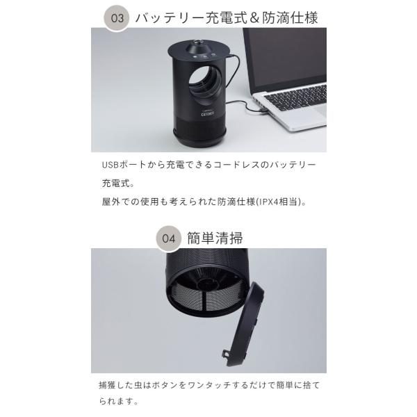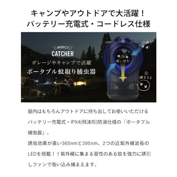 屋内はもちろんアウトドアに持ち出してお使いいただけるバッテリー充電式・IPX4(飛沫形)防滴仕様のポータブル蚊取り捕虫器。