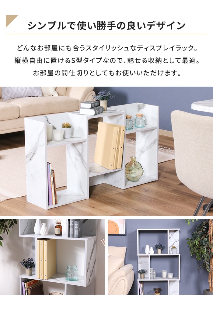 オープンラック S字型 幅59 大理石調 ディスプレイラック リビング収納 インテリア 飾り棚 家具 収納 おしゃれ モダン S字ラック シェルフ オープンシェルフ 間仕切り 3段 59×24 収納家具 魅せる収納 ディスプレイ 小物置き 花台 大理石 リビング ダイニング 寝室 ワンルーム