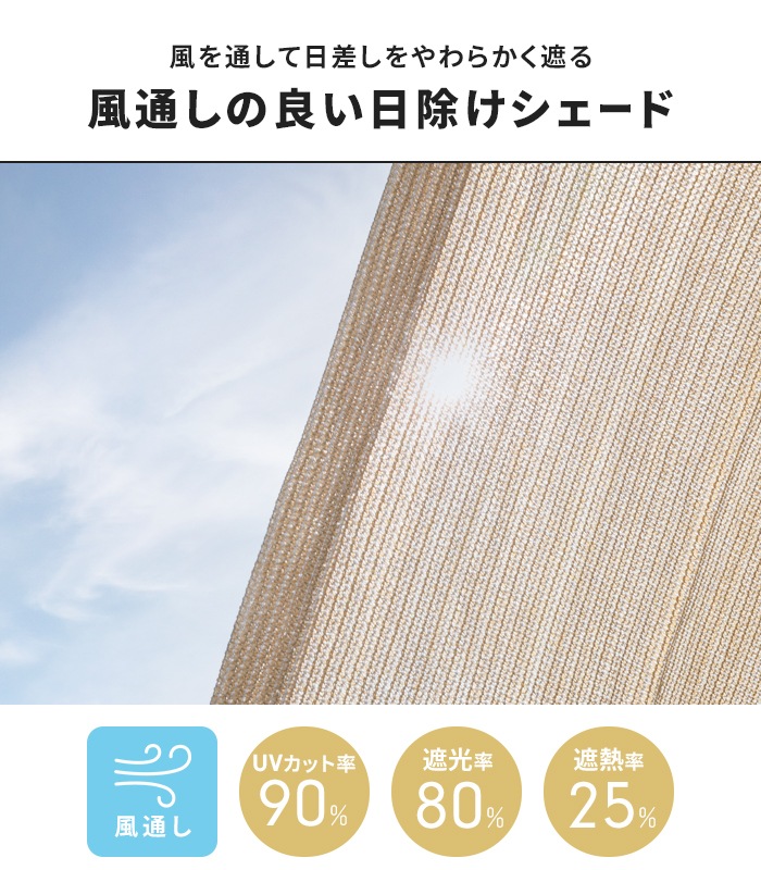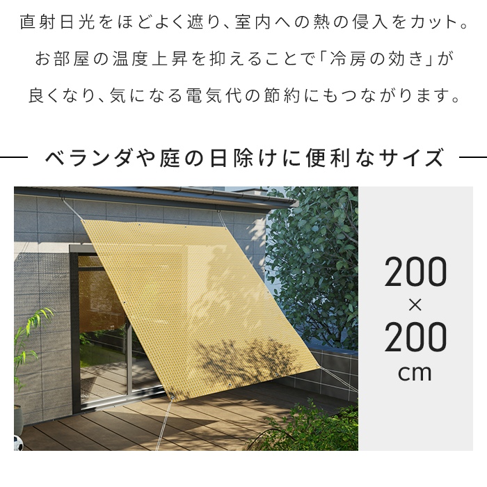 サンシェード 200×200cm 日よけ ベランダ 庭 窓 UVカット80% 遮光80% メッシュ 日除けシェード 目隠し 遮熱 風通し 屋外対応 洗える ロープ付