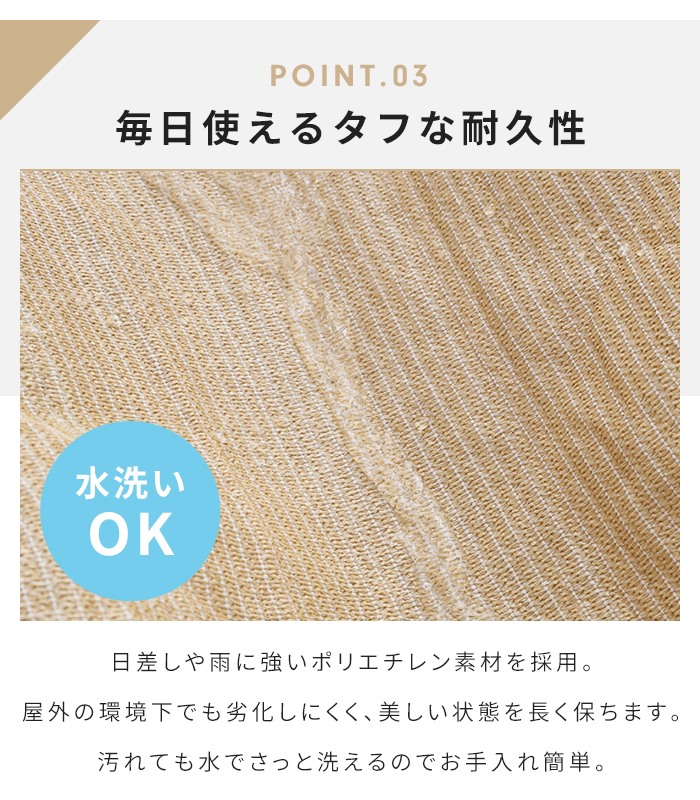 生地には屋外使用に適したポリエチレン素材を使用し、汚れても水洗いできるのでお手入れも簡単。
