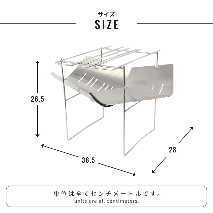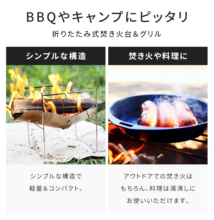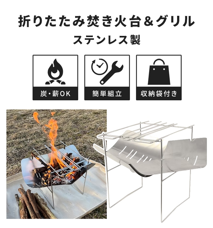 シンプル構造で軽量かつコンパクトに持ち運べる、折りたたみ式ステンレス焚き火台&グリル。