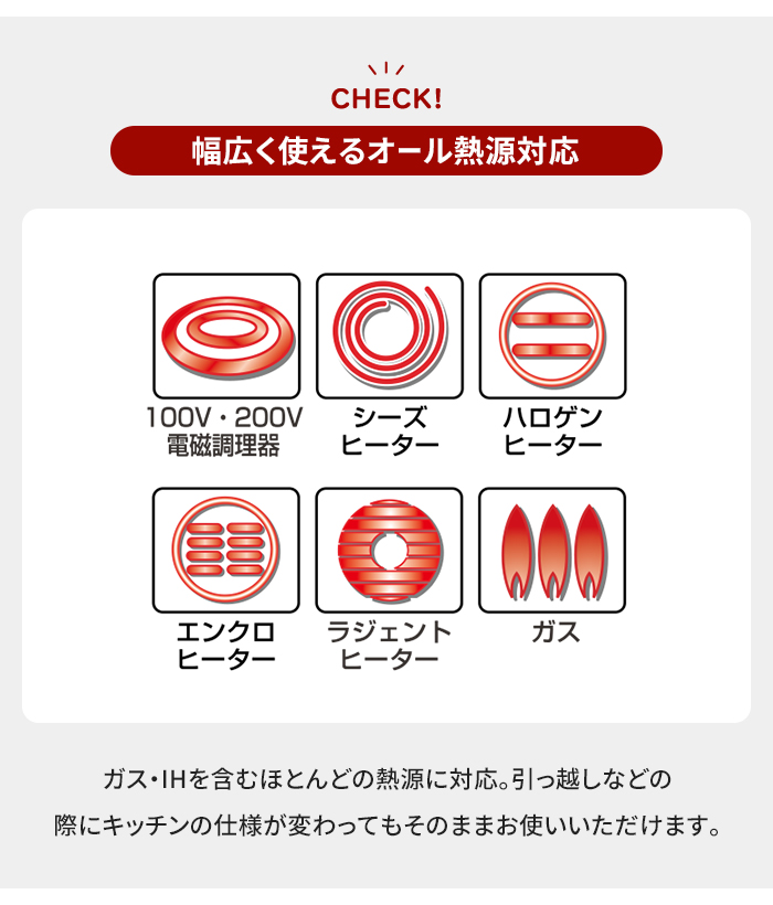 IHからガス火まで、すべての熱源に対応。