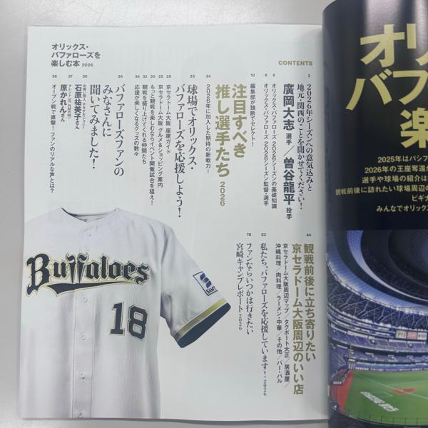廣岡大志選手と曽谷龍平投手のインタビューをはじめ、注目の選手や本拠地・京セラドーム大阪の座席案内、球場グルメなど、