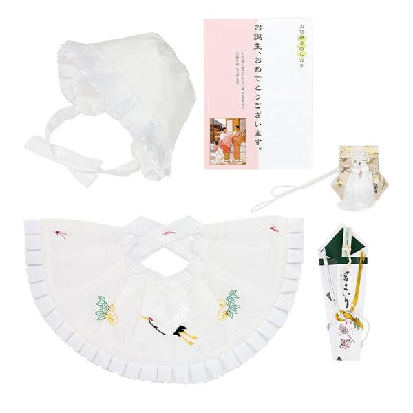 フード(帽子)とよだれかけとお守り袋と末広扇子の4点セットです。