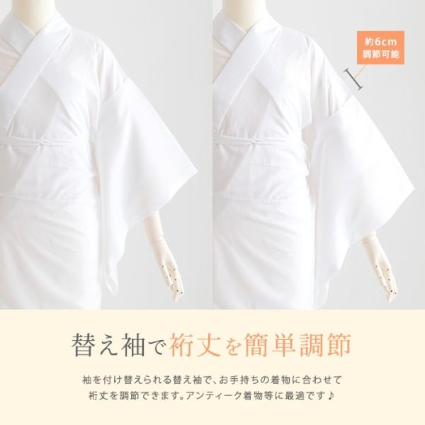 この肌襦袢1枚で、肌襦袢と長襦袢の2役を兼ねているアイデア商品です。とりかえられる替え袖で裄丈を自由に調整でき、さらに半襟と衣紋抜きが付いています。腰紐縫い付け済みのスリップタイプなので、これ一枚ですぐに着物や浴衣を着ていただけます。