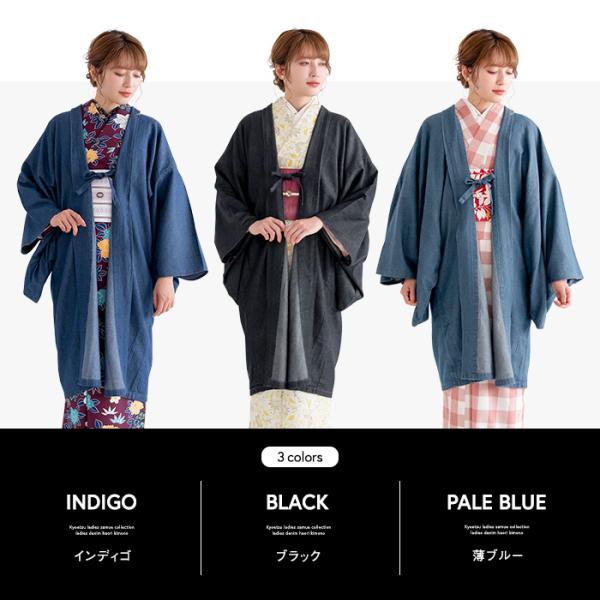 (女羽織 デニム) 羽織 単衣 デニム デニム羽織 着物 女性 レディース 3colors M/L 無地 黒 紺 青 おしゃれ 綿 薄手 春 夏 秋 通年 羽織紐 和風 洗える(rg)