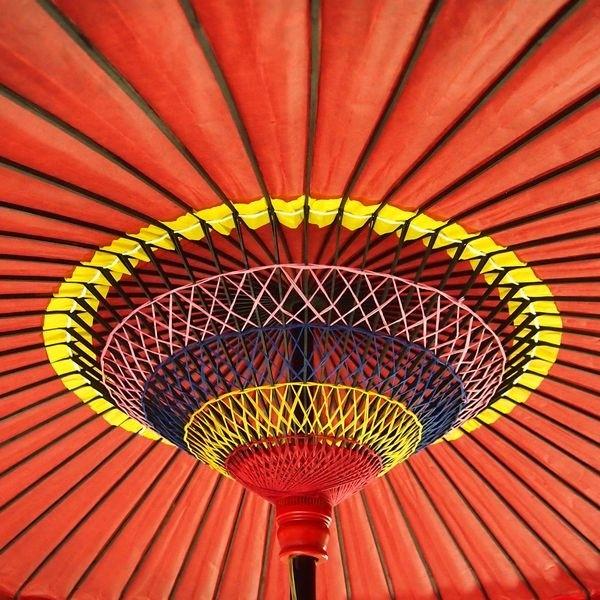 傘布に羽二重(正絹と和紙を重ね合わせ)が使用されていることにより従来の和傘よりも傘布の強度が増し、表面を絹張りしているので、傘表面の光沢がより高級感を際立たせます。