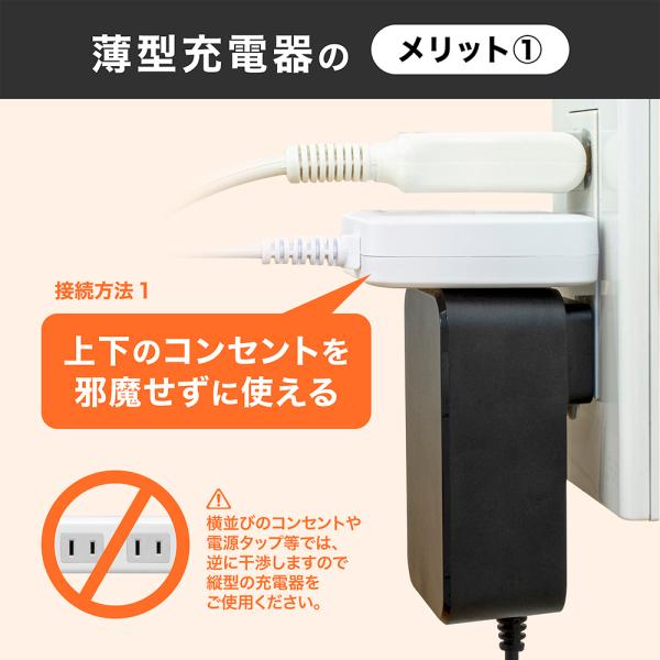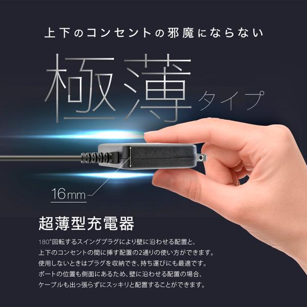 上下のコンセントを邪魔せずに使える薄型充電器の中でも極薄な厚さ16mm。