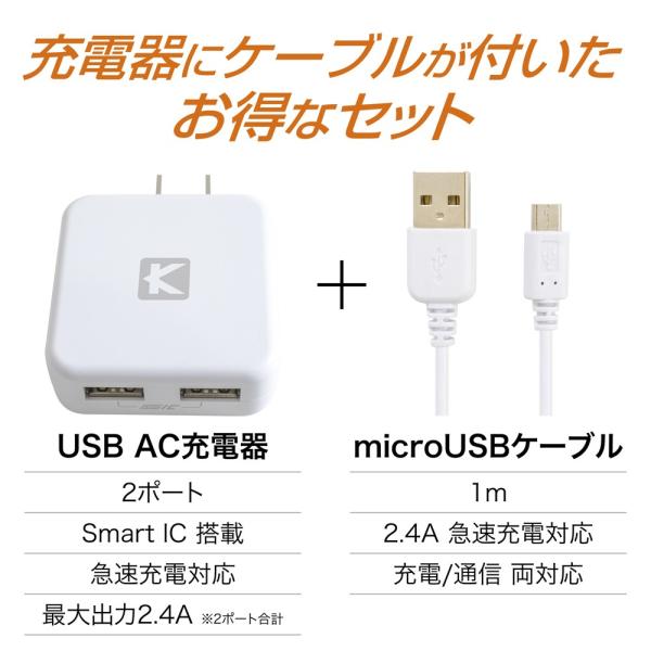充電器 android USB充電器 2ポート 2.4A 2台同時 急速充電器 スマホ xperia galaxy aquos 各種microUSB対応端子 マイクロUSBケーブル付セット