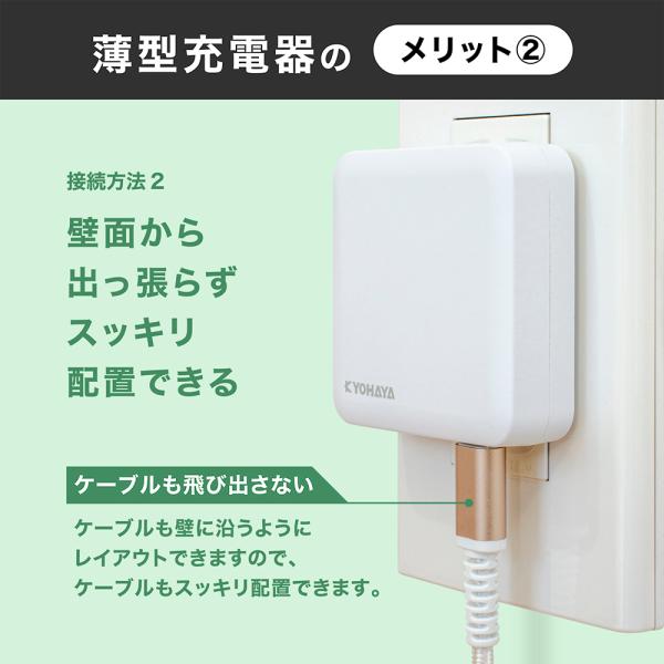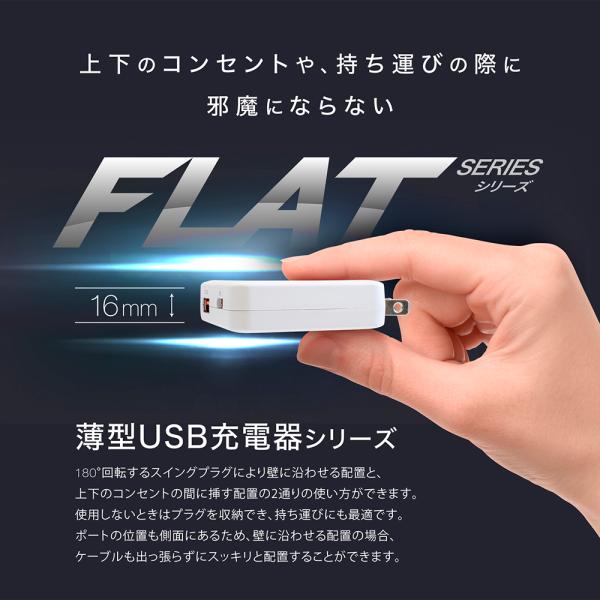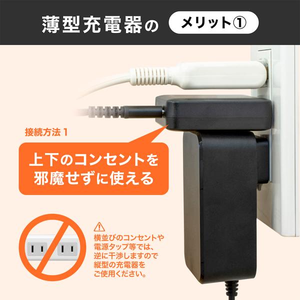 上下のコンセントを邪魔せずに使える薄型充電器の中でも極薄な厚さ16mm。小さなポケットにもすんなり入るので持ち運びに最適です。