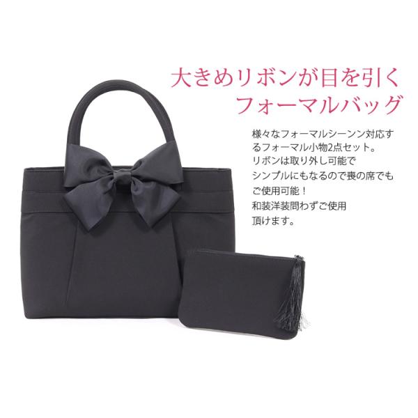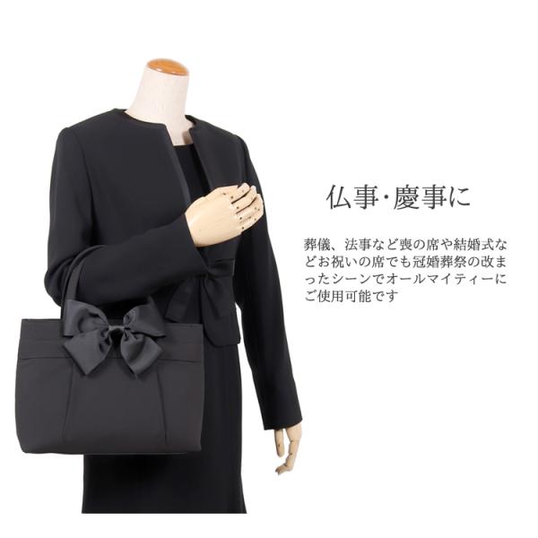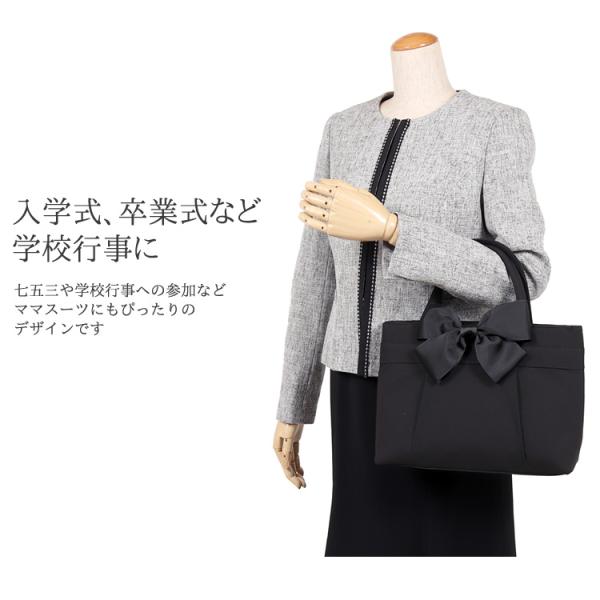 大きいリボンがポイントのこちらのバッグは喪服、礼服用として葬儀、法事でのご使用がベースになっておりますが結婚式や二次会などパーティーの他にも卒業式、卒園式、お受験など様々なフォーマルシーンでもご使用いただけます。