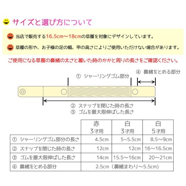 ・お手持ちの草履の形や、お子様の足の幅、甲の高さにより、ご使用いただけない場合があります。