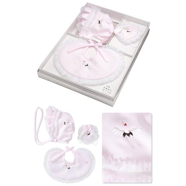 お宮参り 小物セット よだれかけ 帽子 お守り 鶴 刺繍 ピンク 洋フード帽 スタイ