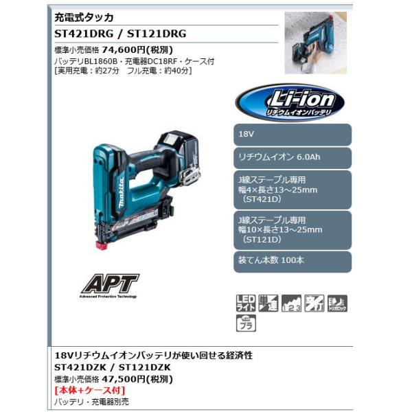 マキタ 18V 充電式タッカ ST121DZK J線ステープル専用/10mm 本体+ケース付(バッテリ・充電器別売)