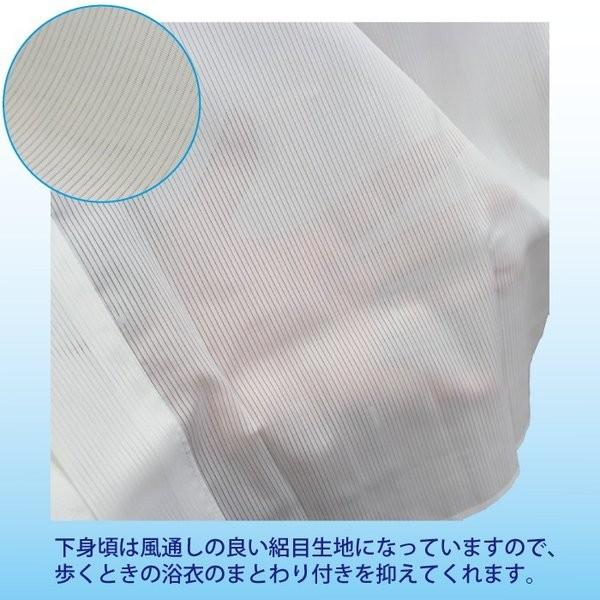 上半身は吸湿性の良い綿100%素材です。裾まわりは通気性が良く裾さばきしやすい絽目生地になっています。上から下までつながったワンピースタイプで、腰ひもが縫い付けてあるので上前と下前を打ち合わせて紐を結ぶだけでサッと簡単に着用できます。
