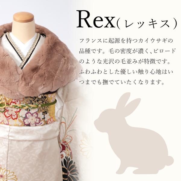 着物、和服、和装、成人式振袖などに最適な和装用ショールです。フランスに起源をもつウサギ(レッキス)の毛皮ショールです。ビロードのような光沢としっとり滑らかな手触りでふわふわと非常に心地よい毛並みです。ついつい、いつまでも撫でていたくなるような感覚です。