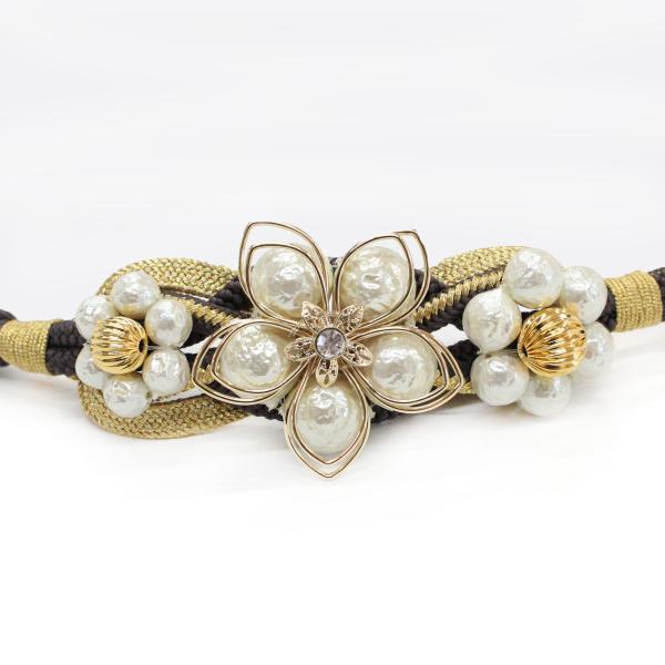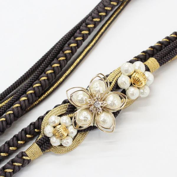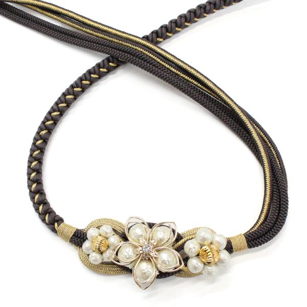 帯締め 成人式 振袖用 茶色 こげ茶 金 ゴールド パール飾り 花飾り 翠嵐工房 日本製 正絹 おびじめ 組みひも 組紐 帯〆 和装 着物