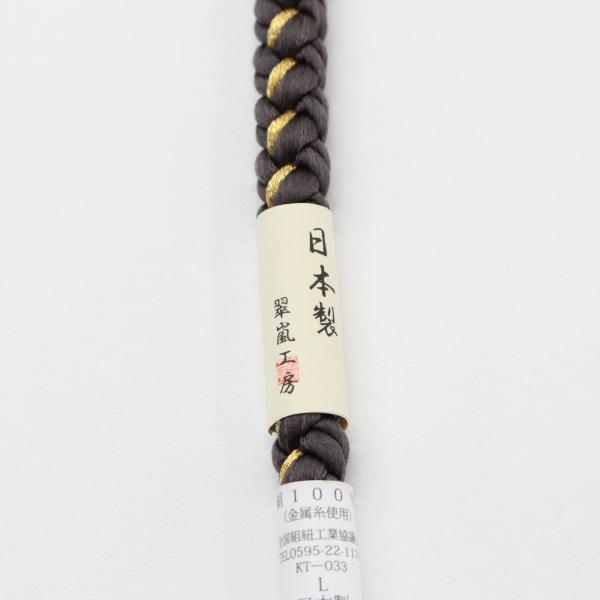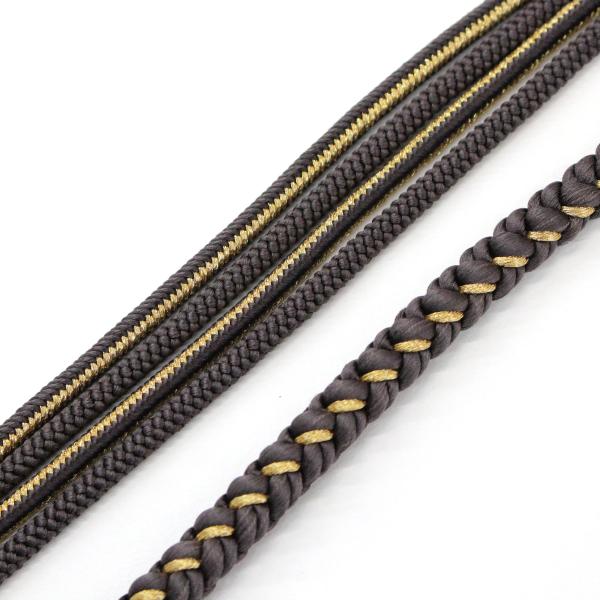 薄めの焦げ茶色に金糸が組み込まれた太軸の組ひもを主軸に、もう片方は細い組みひもが4本に分かれています。