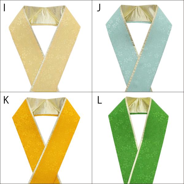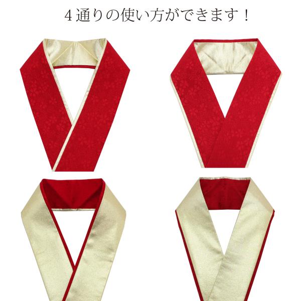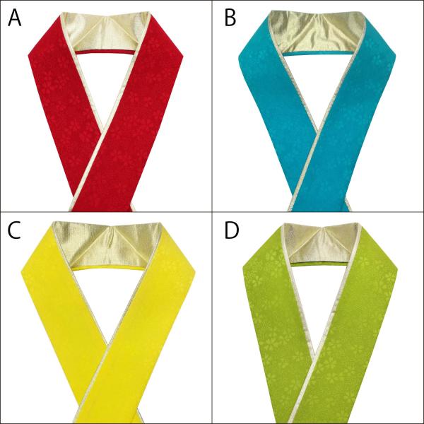桜の地柄のある色地と金地の2色重ねになっています。両面リバーシブルで使えて合計4通りの使い分けが出来るので、着物の色や柄に合わせて使い分けも可能です。固定用のクリップが3個付属しています。色は全部で14種類!お好みの色をお選びください。