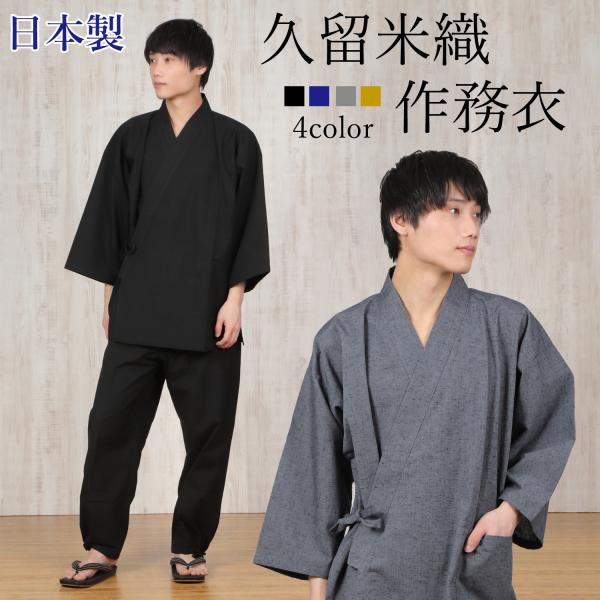 作務衣 メンズ 日本製 久留米織 綿100 春 秋 冬3シーズン 高級 さむえ 黒 紺 グレー からし色 金茶 無地 男性用 紳士 父の日 プレゼント 作業着 普段着