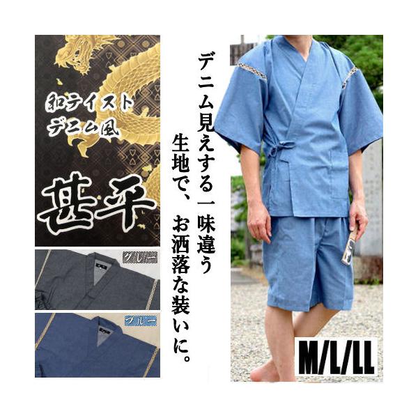 甚平 デニム風 無地 メンズ 和テイスト デニム風甚平 M L LL 綿 ポリエステル 紳士甚平 薄手仕様 父の日ギフト 男性 じんべい 上下セット パジャマ 部屋着 紳士
