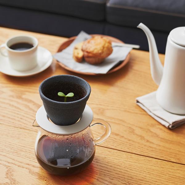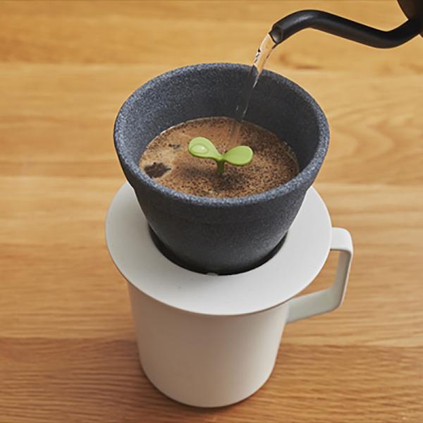 コーヒーを淹れるひとときを楽しむことで、豊かな時間も新芽のように育ちます。植木鉢のようなフィルターから生えている芽の目盛りは、適切なコーヒー豆と湯量の目安にも。