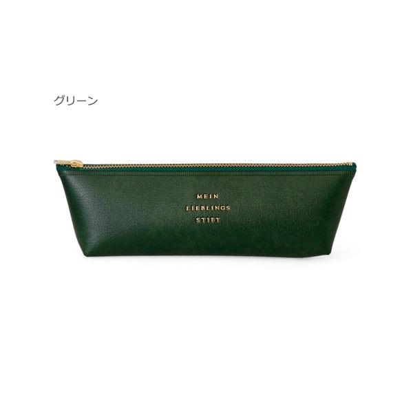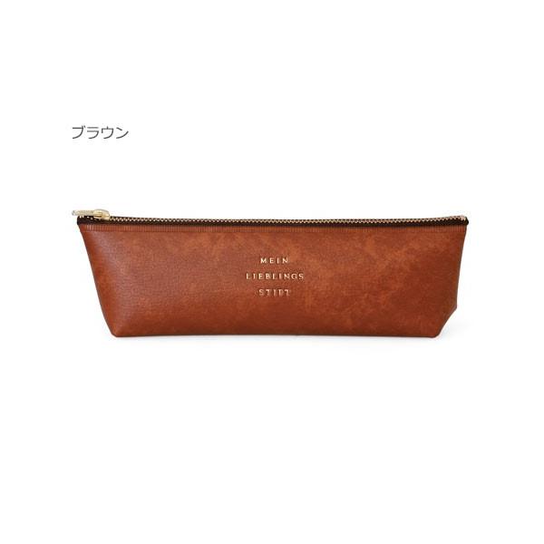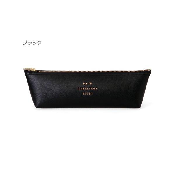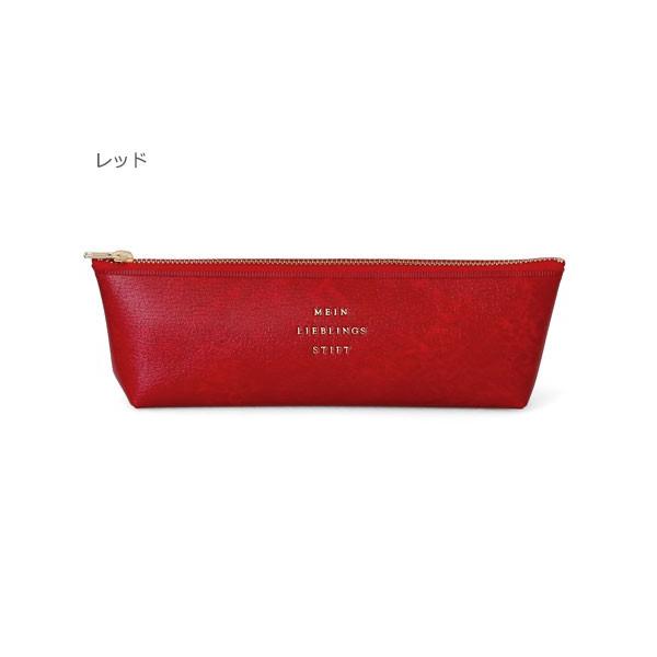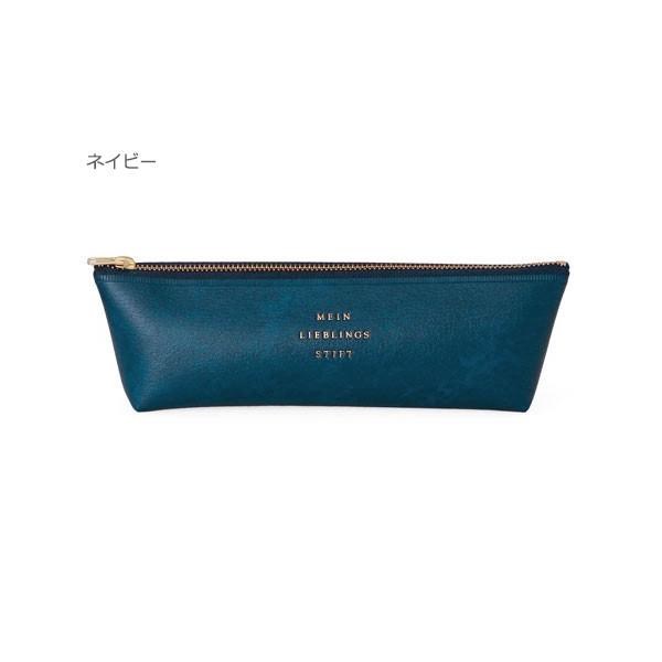ボート型のシンプルなペンケース。さり気ないゴールドのアクセントが上品な佇まい。素材は水濡れや汚れにも強いPVC(ポリ塩化ビニール)で革のようなシボ(しわ)や斑があり、やわらかな手触りも楽しめます。