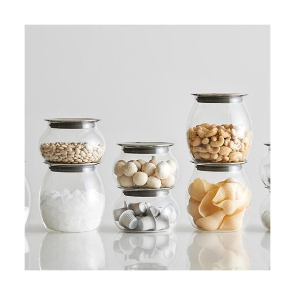 キントーのガラスキャニスター。ぽってりと丸みのあるフォルムがとてもユニーク。フタはヘアライン加工を施したステンレス製でフラットながら心持ち弓なりのラインを描くリッドの縁は、開閉するときの指がかりをなめらかにし、スタッキングにも安定感をもたらしています。使い方やディスプレイ次第で様々な表情を見せてくれる、ささやかな配慮が詰まったキャニスターです。