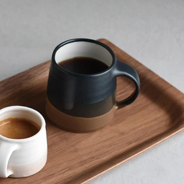 質感が異なる光沢とマットの釉薬が重なることで生まれた奥深い景色は、コーヒーを愉しむ至福のひとときを演出します。本体とハンドルが大きな曲面で繋がっており、緩やかなフォルムは手に心地よく馴染みます。