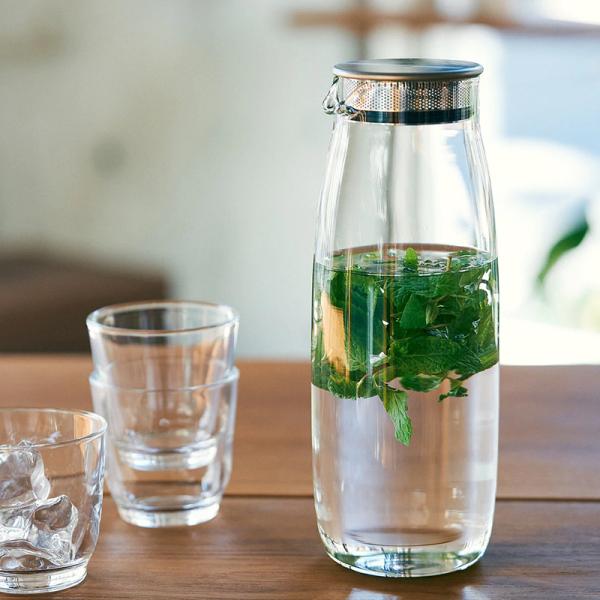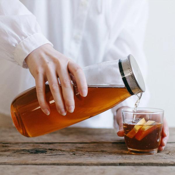 冷蔵庫のドアポケットに収まるサイズで、蓋は注ぐたびに開け閉めする必要がなく、氷やレモンなどを留めながら注げる設計です。付属の細かいメッシュストレーナーに茶葉を入れて水を注ぐだけで、水出しのアイスティーを手軽に作ることができます。