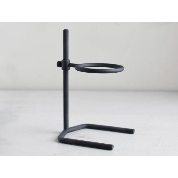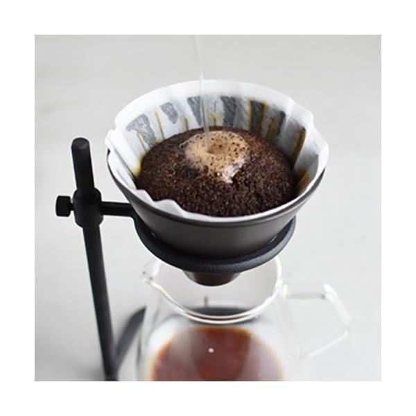 鋳物ならではの無骨な表情が魅力的なブリューワースタンドと、磁器製ブリューワー、ペーパーフィルター、サーバー、ホルダーのセット。スタンドは抽出量を計りながらドリップできるようスケールが納まるデザインで、高さ調節ができる可動式なので、1人用のカップから背の高いサーバーまで、様々な容器と組み合わせて使用できます。スタンドのリング内側はブリューワーの側面とフィットする安定感のある構造です。耐熱ガラス製のサーバーは抽出量の目安となる目盛りが付き、ホルダーはドリップ後のブリューワーを直接置けるので周辺を汚すことがありません。