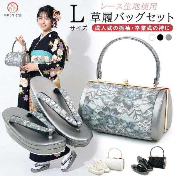 Lサイズ 振袖用 厚底 草履バッグセット zb-089 レース 帯地 白 ホワイト 黒 ブラック 灰色 グレー 振袖 成人式 フォーマル