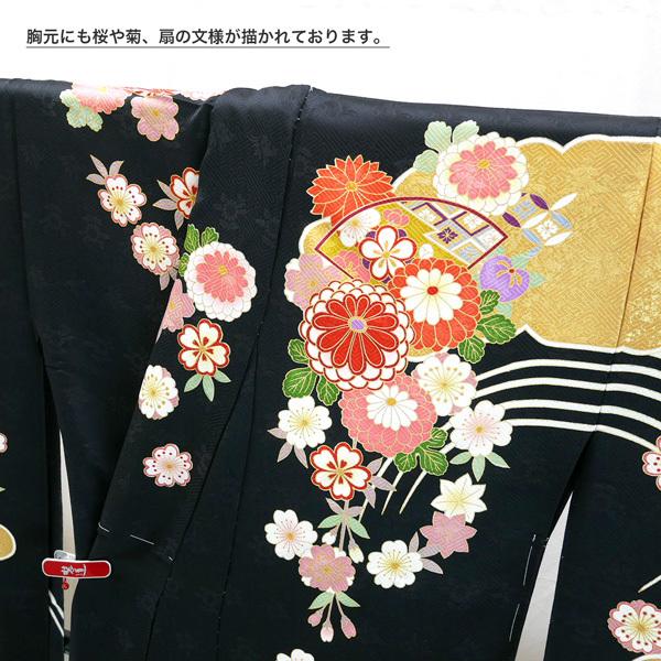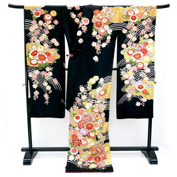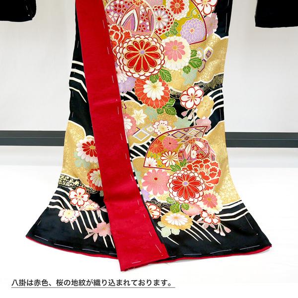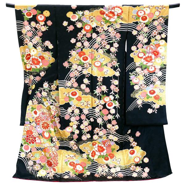 【セール】仕立て付き 正絹 振袖 フルセット32点 f-129 黒 ブラック 桜 牡丹 菊 成人式 卒業式 結婚式 金駒刺繍 セット