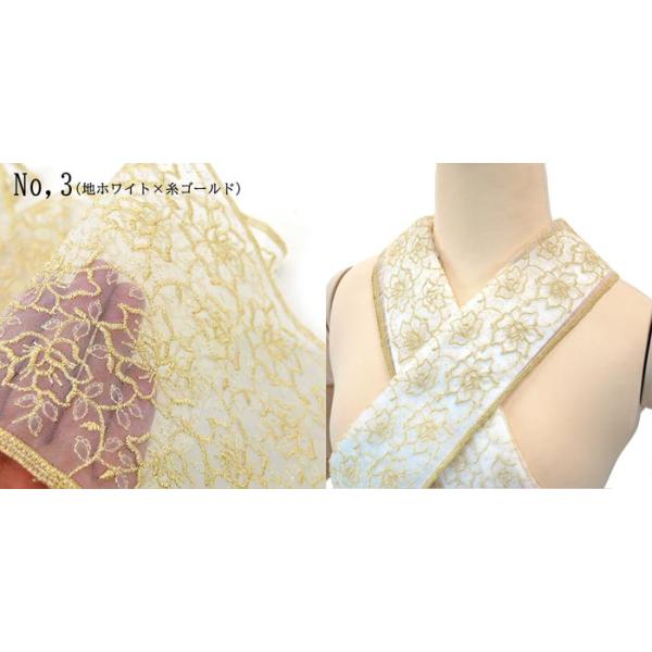 透明感のあるオーガンジー生地に白色や色糸で刺繍が施されたエレガントな半衿です。