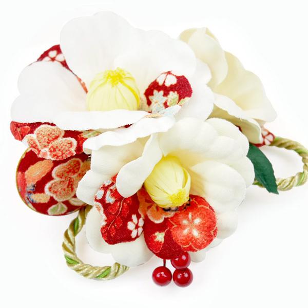 ちりめんで作られた椿と千両・手毬・金の紐飾りが合わせられた大変華やかな髪飾りです。