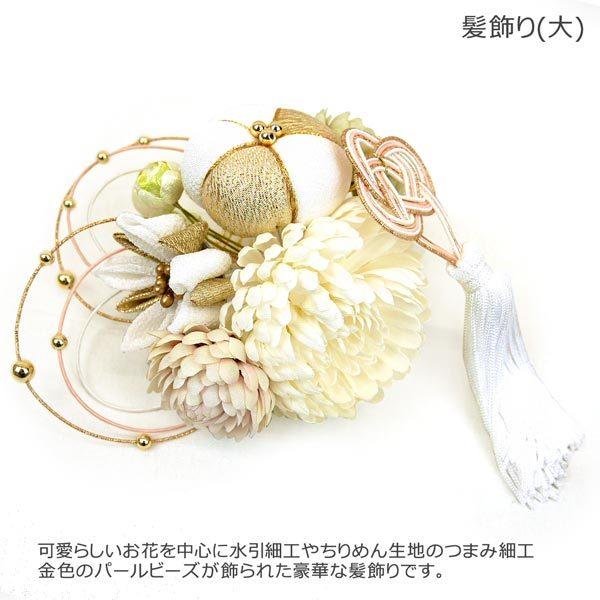 お花のまわりには水引細工やちりめん生地のつまみ細工、金色ビーズが豪華に飾られております。