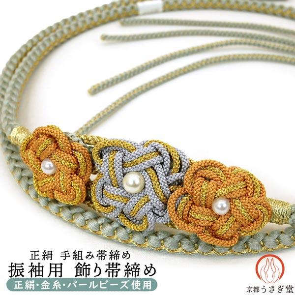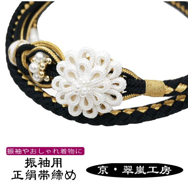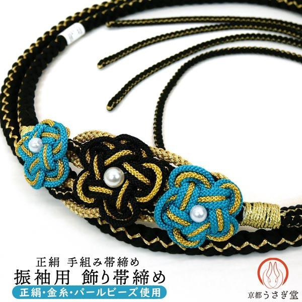 正絹 振袖用 飾り帯締め oj-532 組みひも 組み紐 黒 ブラック ターコイズブルー パールビーズ 帯じめ 帯締め 成人式 結婚式