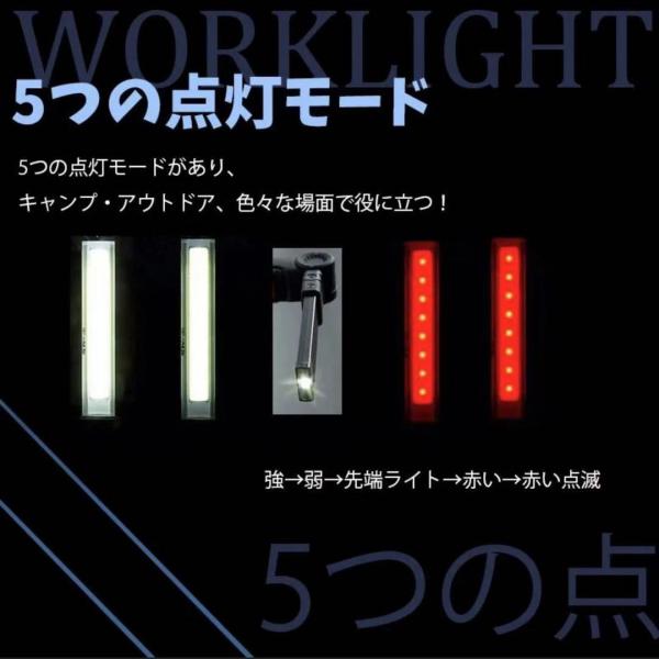 このワークライトの電源ボタンを押して、5つの点灯モードが切り替えます。