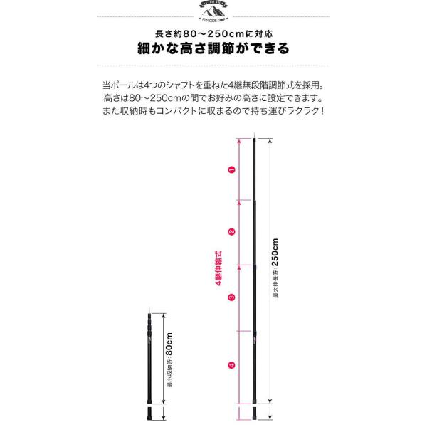様々なシーンで使える、スライド伸縮式テントポール!ポールをスライド、回して固定するだけで長さ調節が可能。高さは無段階で80cm〜250cmに調節できます。安心の最大直径32mm。収納時もコンパクト!