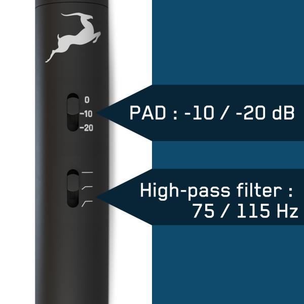 ・75Hzと115Hzの2段階のハイパスフィルターにより、不必要な帯域をカットし、よりクリーンでタイトな低域の録音が可能。