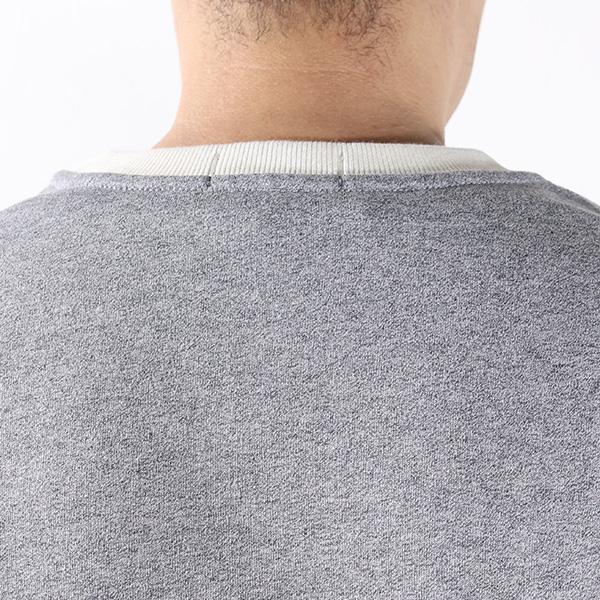 裏起毛仕様の長袖デザインで、首元・裾・袖口はリブ仕立てにし、袖口のラインがさりげないアクセントを添えます。